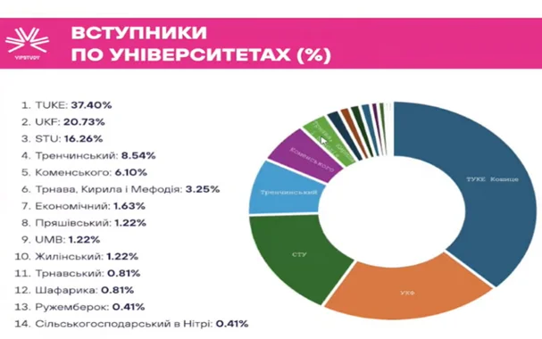 Každoročne sa čoraz viac ukrajinských uchádzačov rozhoduje pre štúdium na Slovensku vďaka cenovo dostupnému európskemu vzdelávaniu, moderným programom a možnosti bezplatnej výučby v slovenskom jazyku. Analyzovali sme výsledky prijímacej kampane na akademický rok 2025/2026 a pripravili sme prehľad najobľúbenejších univerzít medzi našimi študentmi.